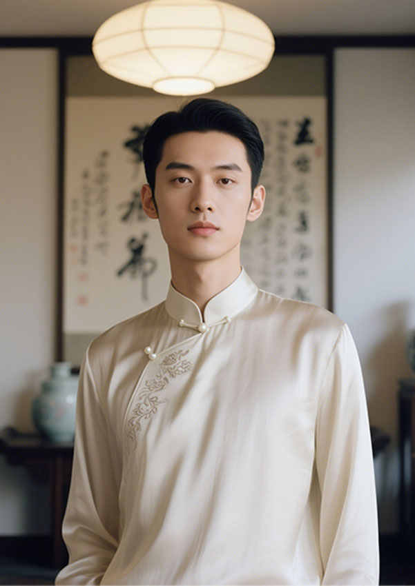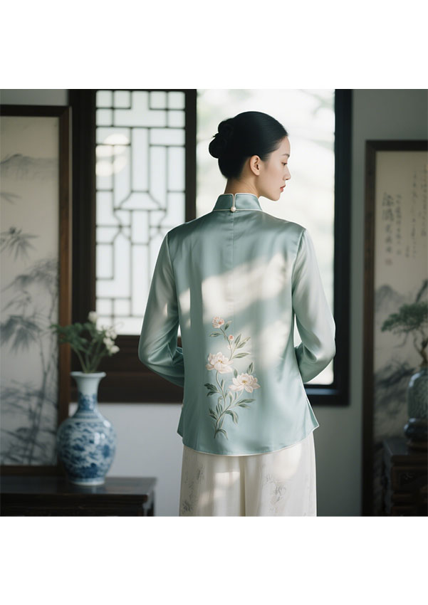 摒弃繁复,重塑经典.衬衫领口融入中式立领改良设计,搭配手工玉石盘扣或暗纹刺绣,既保留“含蓄内敛”的东方韵味,又赋予脖颈线条利落之美.衣身采用不对称剪裁或侧开衩设计,线条流畅如墨,行走间衣袂轻扬,自带新中式独有的松弛感.面料选用桑蚕丝,提花绸缎或哑光醋酸,肌理间暗藏水墨竹影,缠枝莲纹等传统元素,以暗纹提花工艺低调呈现,光影流转间尽显雅致 .